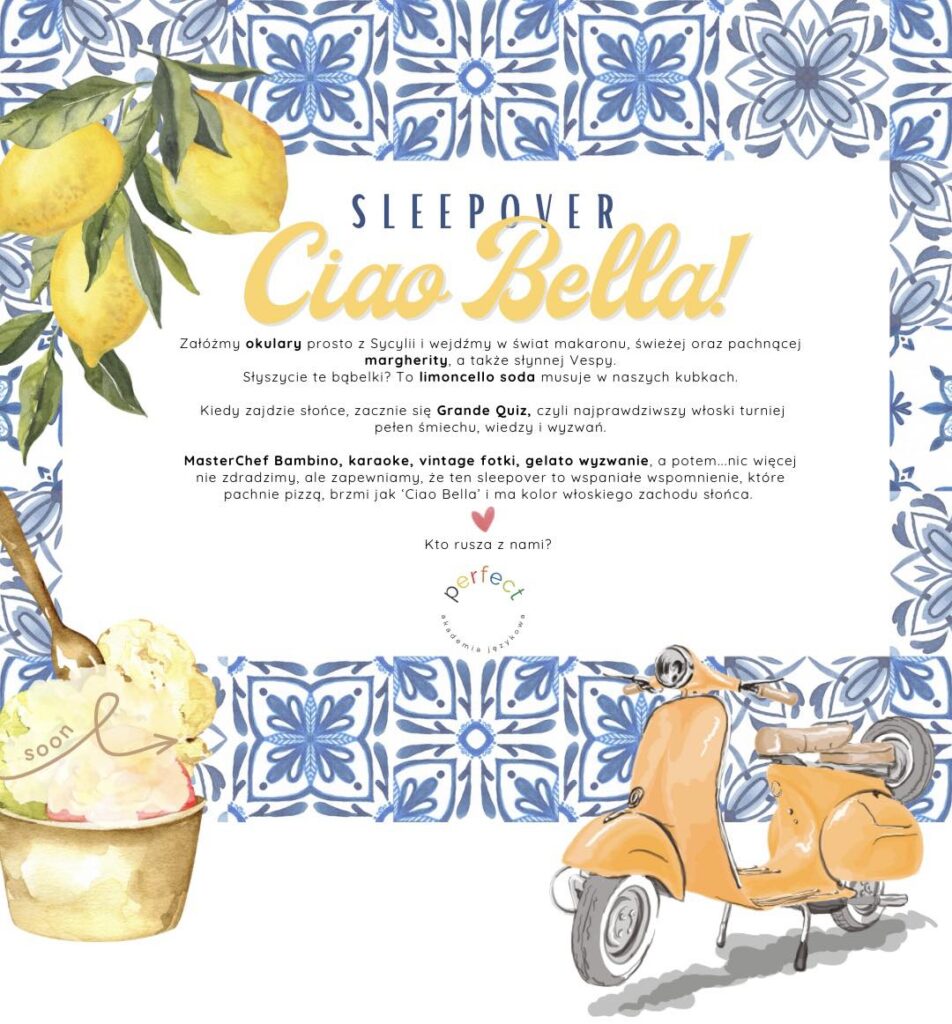 Do historii przechodzi ostatnia w tym roku nocowanka. MasterChef Bambino, karaoke, vintage fotki, gelato wyzwanie – to były motywy przewodnie tego wydarzenia. Natomiast nie zabrakło też innych atrakcji: wszyscy założyli kolorowe okulary, wzięli udział w quizie wiedzy o włoskim stylu życia, następnie szkoła zamieniła się w jeden wielki, roztańczony parkiet. Energii do zabawy dostarczały smaczne owoce, a niektórym podobno udało się chwilę zdrzemnąć.