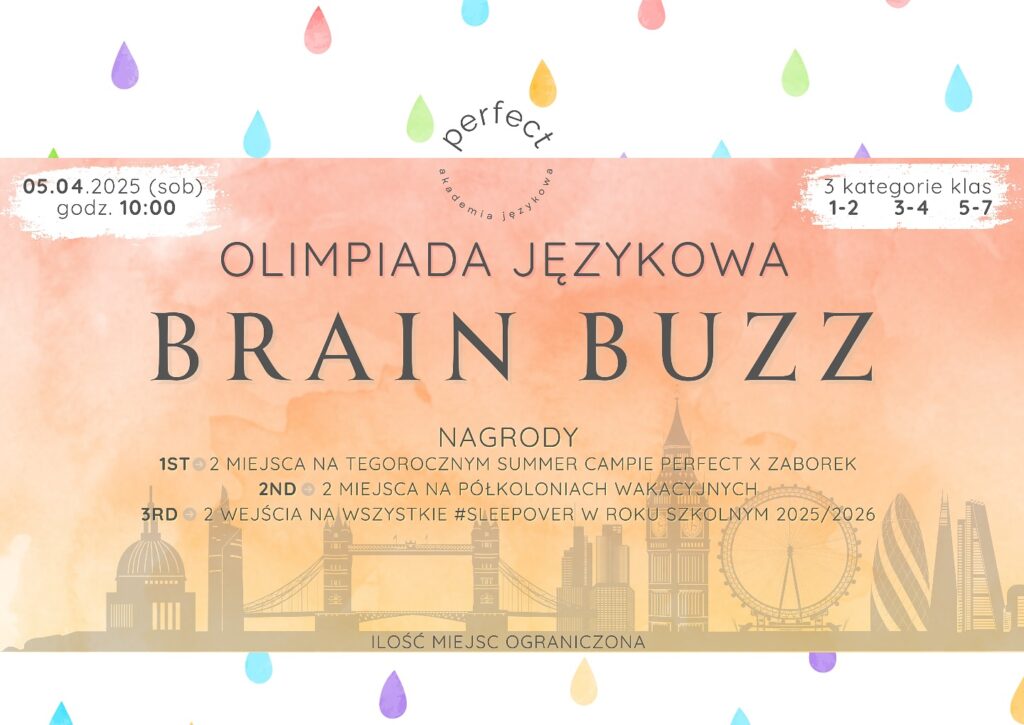 Zachęceni odbiorem poprzedniej edycji ruszamy z drugą Olimpiadą Językową Brain Buzz! Pamiętacie, jak było rok temu? Na pewno trudno: nasi lektorzy przygotowali wymagające zadania, sprawdzające wszystkie zdolności językowe. Dwójka uczniów poradziła sobie znakomicie i zdobyła atrakcyjne nagrody. W tym roku łatwiej nie będzie, ale oczywiście jest o co walczyć, bo oferujemy następujące nagrody: 1. miejsce: